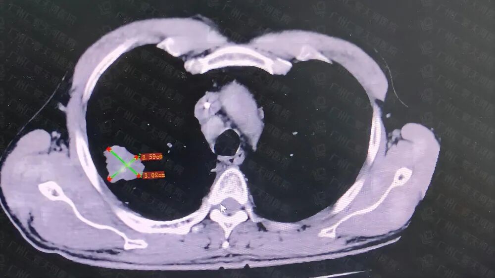 据悉,黄大爷曾因“咳嗽、咳痰一月余”,于广州市多家三甲医院就诊,行胸部CT考虑“右上肺恶性肿瘤并右侧胸膜及斜裂多发转移,并右上肺癌性淋巴管炎;两肺多发转移瘤;双侧肺门及纵膈多发肿大淋巴结,未除外转移”,经抗炎、镇咳、化痰及对症支持治疗后咳嗽、咳痰症状加重,并出现活动后气促,胸闷。为求进一步治疗,特来我院就诊。